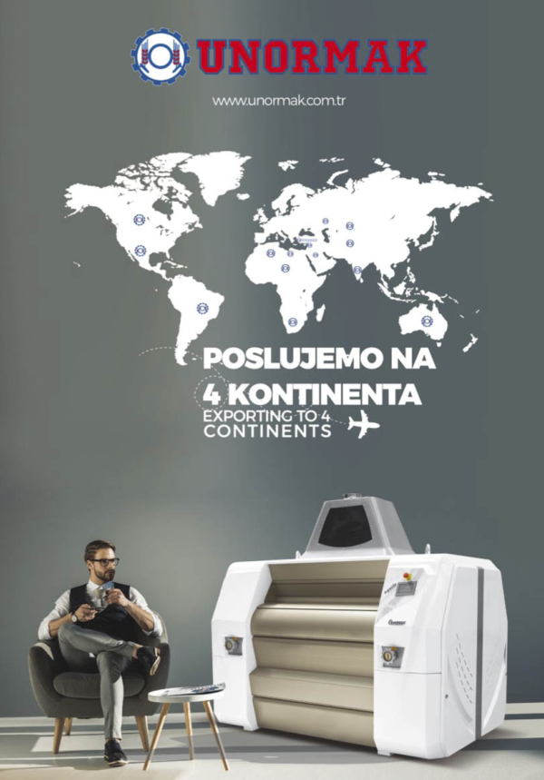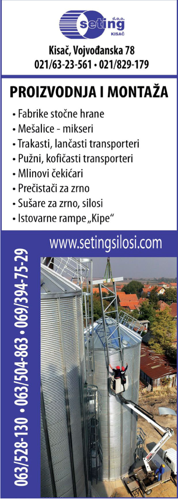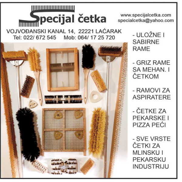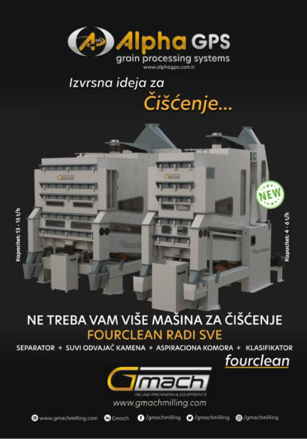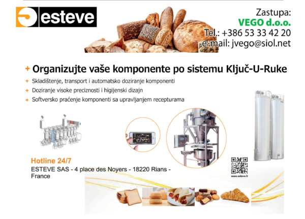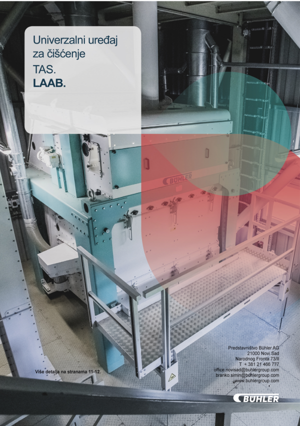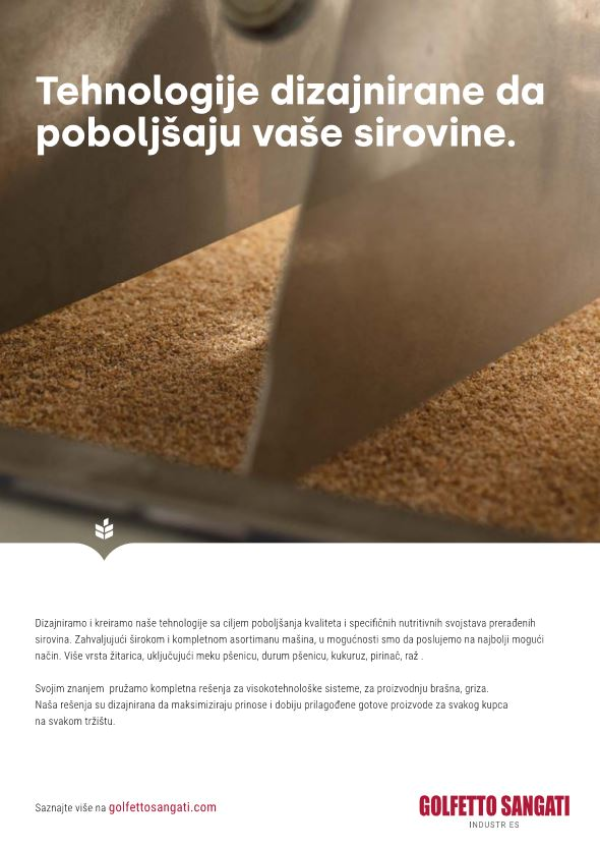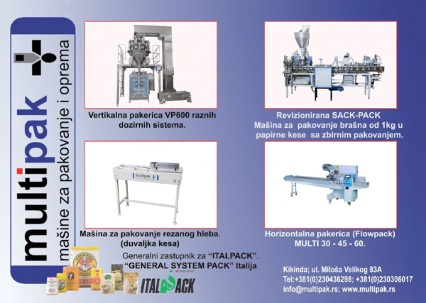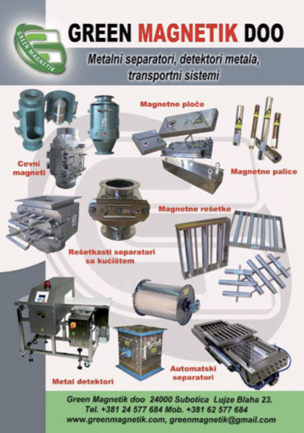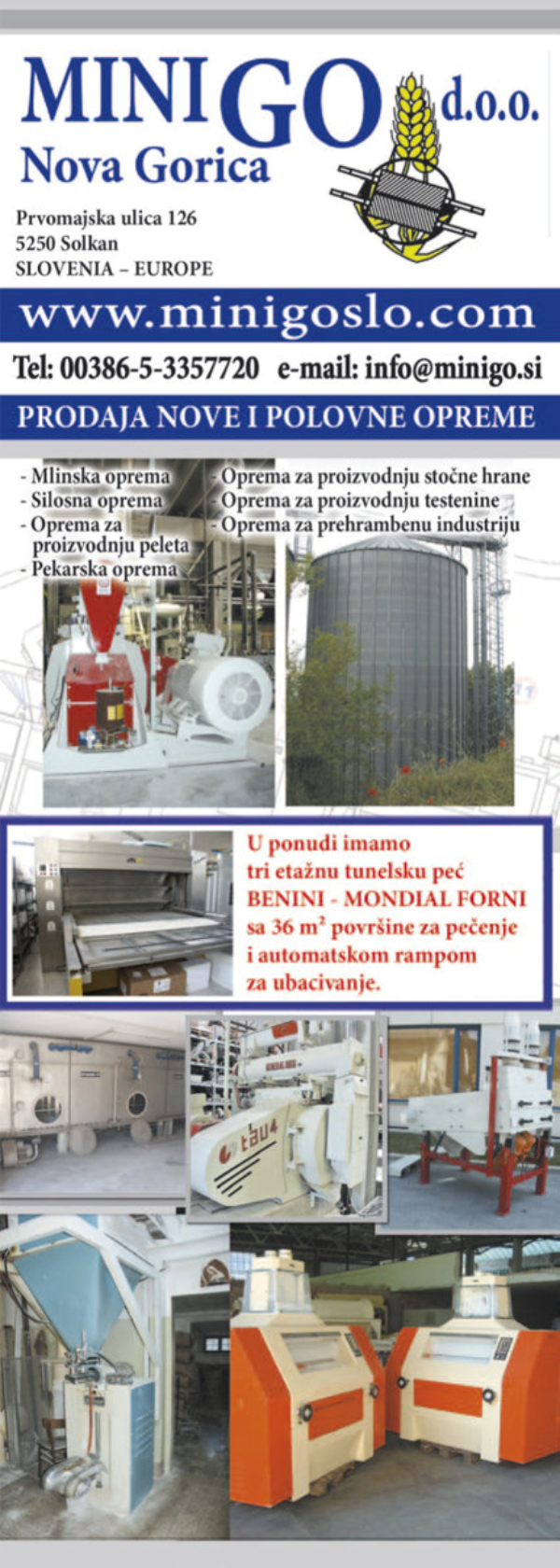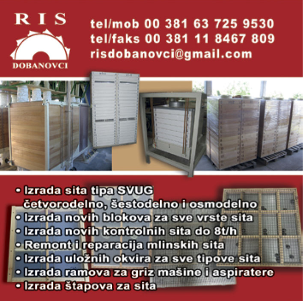 Na prodaju ispravna automatska linija za kilsko pakovanje brašna Fawema sa zbirnim pakovanjem, automatskom kon- trolnom vagom i termo tunelom. Dimen- zije kesice 115 x 65 x 330 mm. Kapacitet 17 t / 8 h. Godište 1993/2002. Može se videti u radu u JUB Šimanovci. Tehn. dir. Zagorka Mikić 063 107 27 27 Prodajem Aquatron nemačke proizvodnje (2.500 €) i aplikator za markice (3.500 €), moguć dogovor. Tel.: 062/212-638 Prodajem kompletnu Bühler-ovu silosnu opremu za brašno kapaciteta 950 tona (vibro­izu­zimači, razdelnici, transporteri, sterilizatori, duvaljke, obične i kompon- entne vage, šaržna mešalica, magnetni odvajači, sita, ustave, ventilatori, motori i cevi). Kontakt osoba: Slobodan, zvati od 10-20h, 063/212-839 Prodajem 6 valjnih stolica (Rosi Romeo), 2 šestodelna planska sita, pneumatika kom- plet (sa 12 i 10 ustava), 4 valjne stolice (Partisani), 1 valj­na stolica (Bühler), 2 osmodelna plan­ska si­ta, metalni aspirater (Zmaj), 2 trijera,1 dupla metalna ribalica (Zmaj) i praonicu. Kontakt: Miloš 064/44-26-405, 022-441-082 Prodaje se mlinska oprema: Vaga Vollenda VWE-9000 (Vollenda-WERK), 2 Mlinska aspira­tera mo­del SMA 10 M 6 t/h (Schmidt- Seeger), NP Ventilator za aspir- aciju aspiratera (VEM motors GmbH), 2 Ventilatora u sistemu pneumatskog trans- porta GBJ G09040 E4 RD i LG (Ocrim), Rezervni trupci za valjne stolice. Kontakt osoba: Zoltan 063/409-205 Na prodaju dupla ventil pakerica za brašno (25-50 kg) marke Paglierani. Kontakt: 063 80 46 650. Prodajem novu poluautomatsku ventil pu­ni­­licu za brašno od 5 kg. Kontakt: Milorad Batalo 063/521-577 Na prodaju valjna stolica SANGATTI 600×220, dva kvadratna planska sita čet- vorodelna DOMŽALE, dva drvena planska sita četvorodelna SANGATTI, dve mešalice za brašno dužine 3 metara, tri vrgača POBEDA, pužni transporteri fi150-200, kofičasti elevatori kapaciteta 10-15t/h, mlinski trijer ZMAJ, pneumatski ventilator kapaciteta 100t/24h. U ponudi takođe i aspiracione cevi i lukovi raznih prečnika i dužina i dva elektro ormara za mlin sa pratećom opremom. 062 84 06 124 Petar Na prodaju mlinska oprema: 5 valjnih stol- ica 800 MIAG kapaciteta 35 t/24h, sito osmodelno ZMAJ, ventilator pneumatski Bühler sa motorom 30kW, 2 silosa 5m prečnika i 13,5m visine, 4 silosa 3m prečnika i 13,5m visine. Mašine su u radu, sve ispravno. Imamo i majstora za montažu. Brana 063/276-098, Saša 063/214-920 Prodajemo četke za planska sita Itali- janskog proizvođača SIAT. Dimenzije 120x105 cm i 135x 105 cm. Povoljno – dok zalihe traju. 011 39 45 244 Prodaje se kompletan mlin za pšenicu, kapa­citeta 33 t / 24 h. Cena 110.000 eura. Mlin Telečka, Sombor. Za sve dodatne informacije pozovite +381-63/474-817