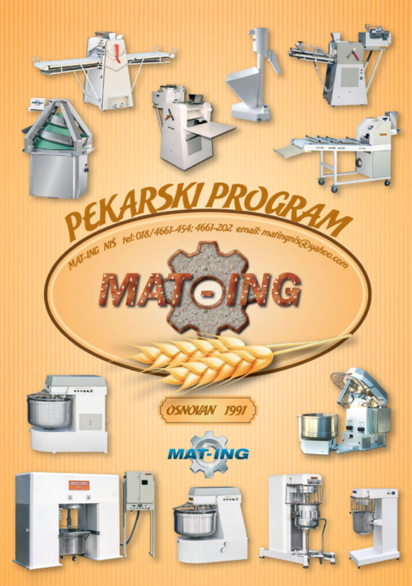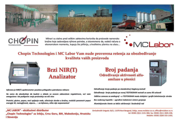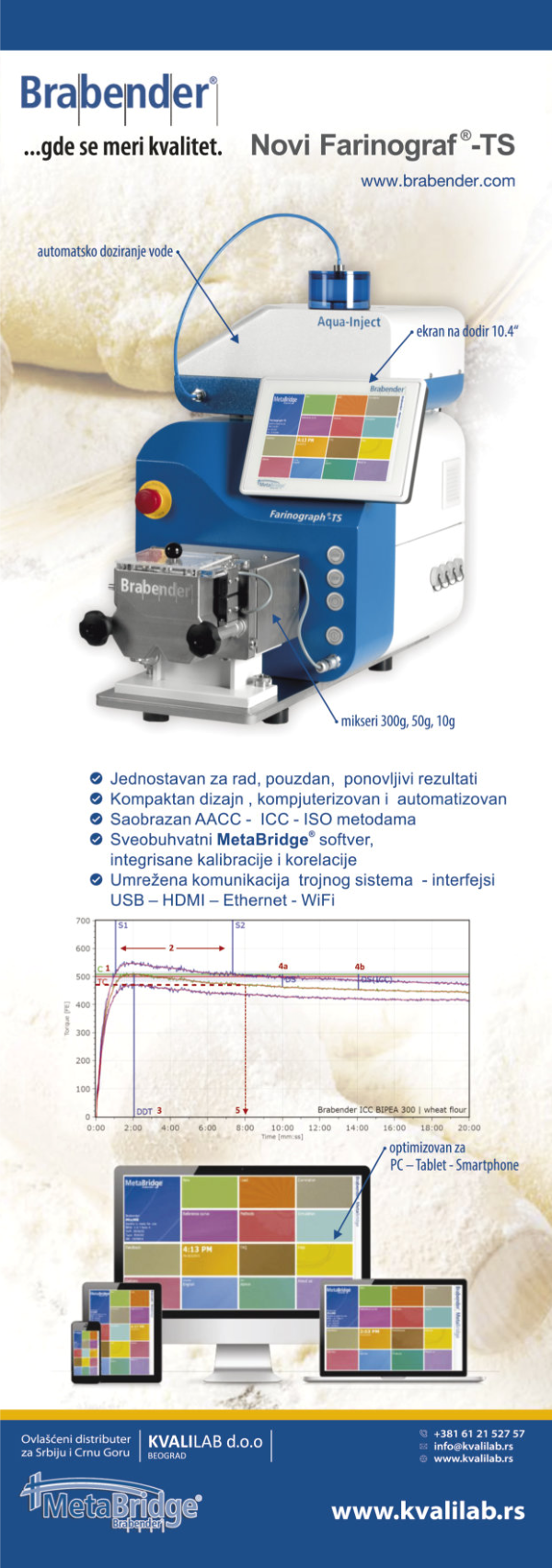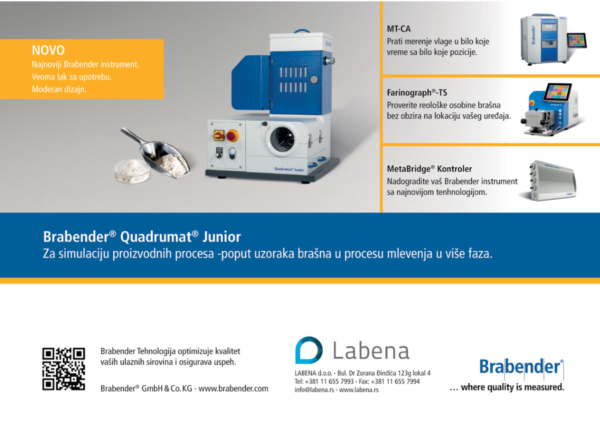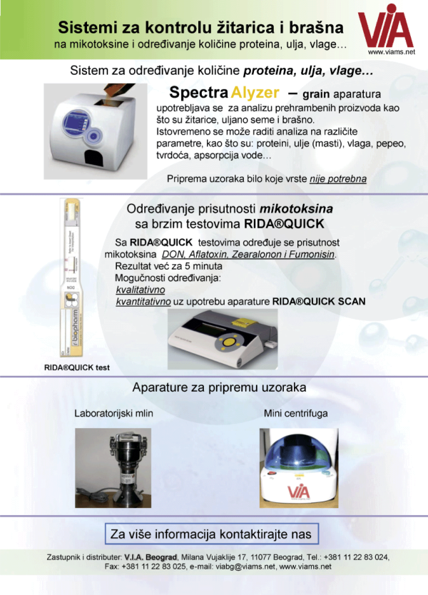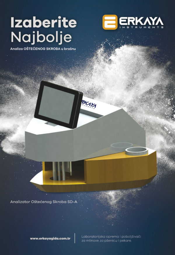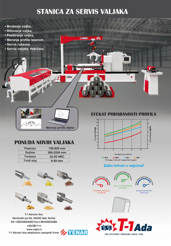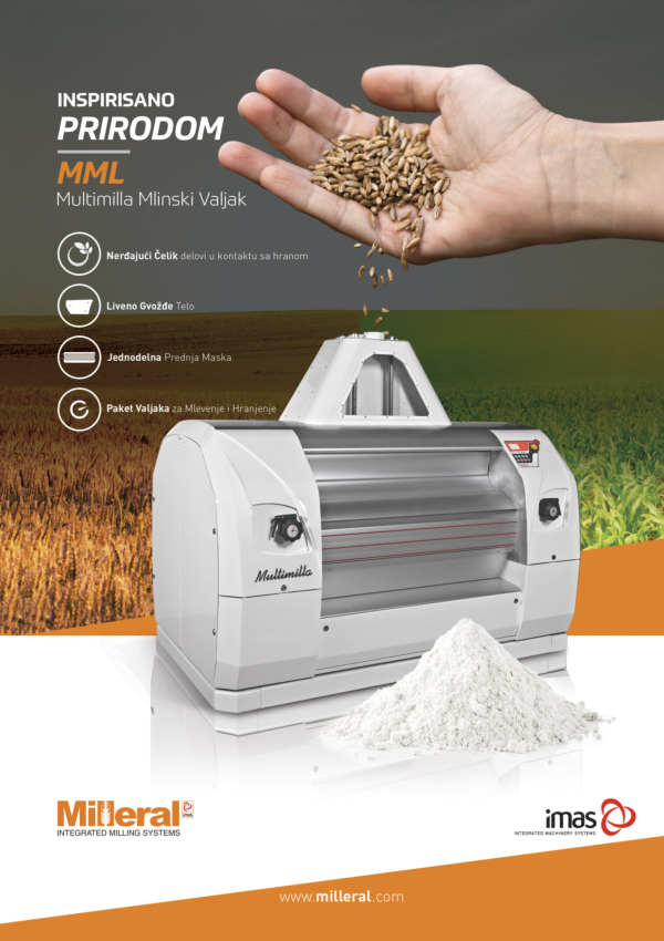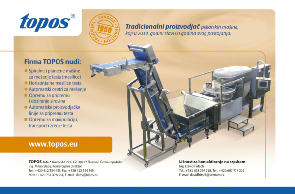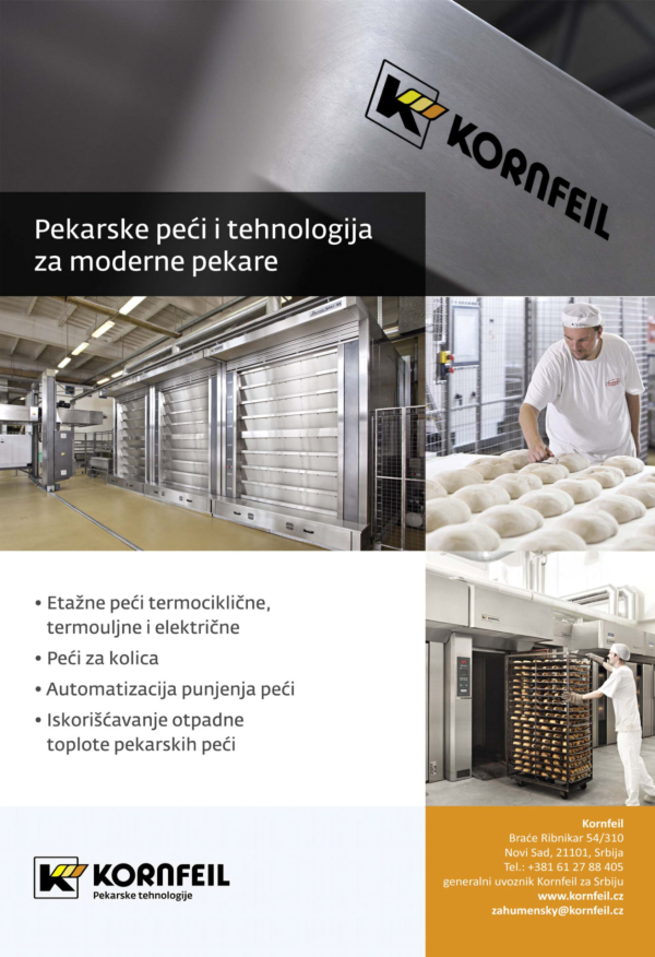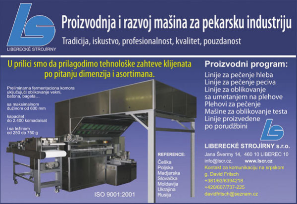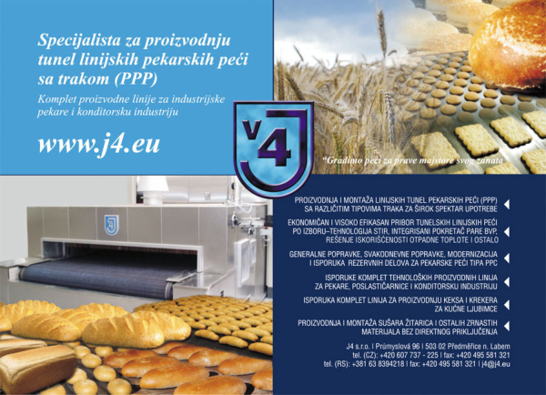 Na prodaju ispravna automatska linija za kilsko pakovanje brašna Fawema sa zbirnim pakovanjem, automatskom kon- trolnom vagom i termo tunelom. Dimen- zije kesice 115 x 65 x 330 mm. Kapacitet 17 t / 8 h. Godište 1993/2002. Može se videti u radu u JUB Šimanovci. Tehn. dir. Zagorka Mikić 063 107 27 27 Prodajem Aquatron nemačke proizvodnje (2.500 €) i aplikator za markice (3.500 €), moguć dogovor. Tel.: 062/212-638 Prodajem kompletnu Bühler-ovu silosnu opremu za brašno kapaciteta 950 tona (vibro­izu­zimači, razdelnici, transporteri, sterilizatori, duvaljke, obične i kompon- entne vage, šaržna mešalica, magnetni odvajači, sita, ustave, ventilatori, motori i cevi). Kontakt osoba: Slobodan, zvati od 10-20h, 063/212-839 Prodajem 6 valjnih stolica (Rosi Romeo), 2 šestodelna planska sita, pneumatika kom- plet (sa 12 i 10 ustava), 4 valjne stolice (Partisani), 1 valj­na stolica (Bühler), 2 osmodelna plan­ska si­ta, metalni aspirater (Zmaj), 2 trijera,1 dupla metalna ribalica (Zmaj) i praonicu. Kontakt: Miloš 064/44-26-405, 022-441-082 Prodaje se mlinska oprema: Vaga Vollenda VWE-9000 (Vollenda-WERK), 2 Mlinska aspira­tera mo­del SMA 10 M 6 t/h (Schmidt- Seeger), NP Ventilator za aspir- aciju aspiratera (VEM motors GmbH), 2 Ventilatora u sistemu pneumatskog trans- porta GBJ G09040 E4 RD i LG (Ocrim), Rezervni trupci za valjne stolice. Kontakt osoba: Zoltan 063/409-205 Na prodaju dupla ventil pakerica za brašno (25-50 kg) marke Paglierani. Kontakt: 063 80 46 650. Prodajem novu poluautomatsku ventil pu­ni­­licu za brašno od 5 kg. Kontakt: Milorad Batalo 063/521-577 Na prodaju valjna stolica SANGATTI 600×220, dva kvadratna planska sita čet- vorodelna DOMŽALE, dva drvena planska sita četvorodelna SANGATTI, dve mešalice za brašno dužine 3 metara, tri vrgača POBEDA, pužni transporteri fi150-200, kofičasti elevatori kapaciteta 10-15t/h, mlinski trijer ZMAJ, pneumatski ventilator kapaciteta 100t/24h. U ponudi takođe i aspiracione cevi i lukovi raznih prečnika i dužina i dva elektro ormara za mlin sa pratećom opremom. 062 84 06 124 Petar Na prodaju mlinska oprema: 5 valjnih stol- ica 800 MIAG kapaciteta 35 t/24h, sito osmodelno ZMAJ, ventilator pneumatski Bühler sa motorom 30kW, 2 silosa 5m prečnika i 13,5m visine, 4 silosa 3m prečnika i 13,5m visine. Mašine su u radu, sve ispravno. Imamo i majstora za montažu. Brana 063/276-098, Saša 063/214-920 Prodajemo četke za planska sita Itali- janskog proizvođača SIAT. Dimenzije 120x105 cm i 135x 105 cm. Povoljno – dok zalihe traju. 011 39 45 244 Prodaje se kompletan mlin za pšenicu, kapa­citeta 33 t / 24 h. Cena 110.000 eura. Mlin Telečka, Sombor. Za sve dodatne informacije pozovite +381-63/474-817