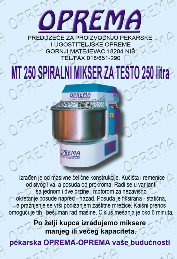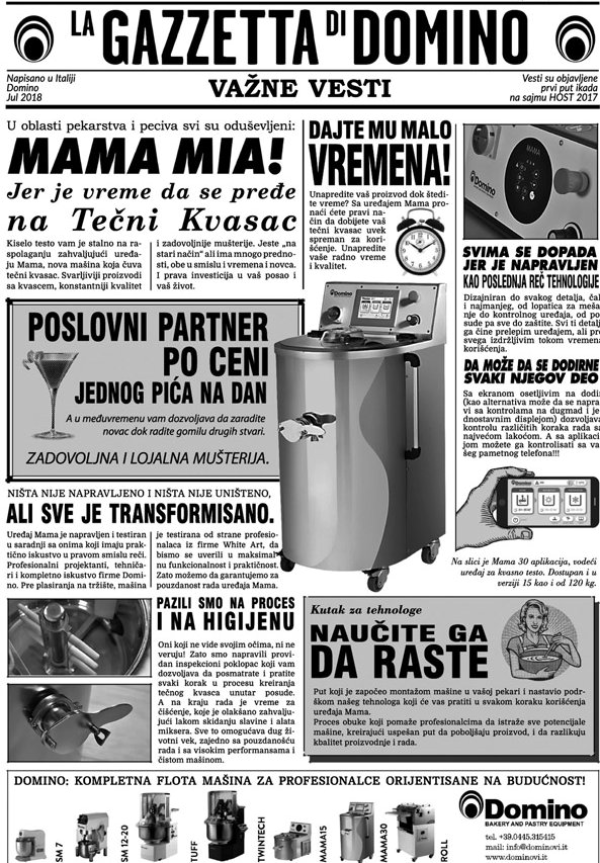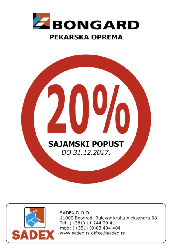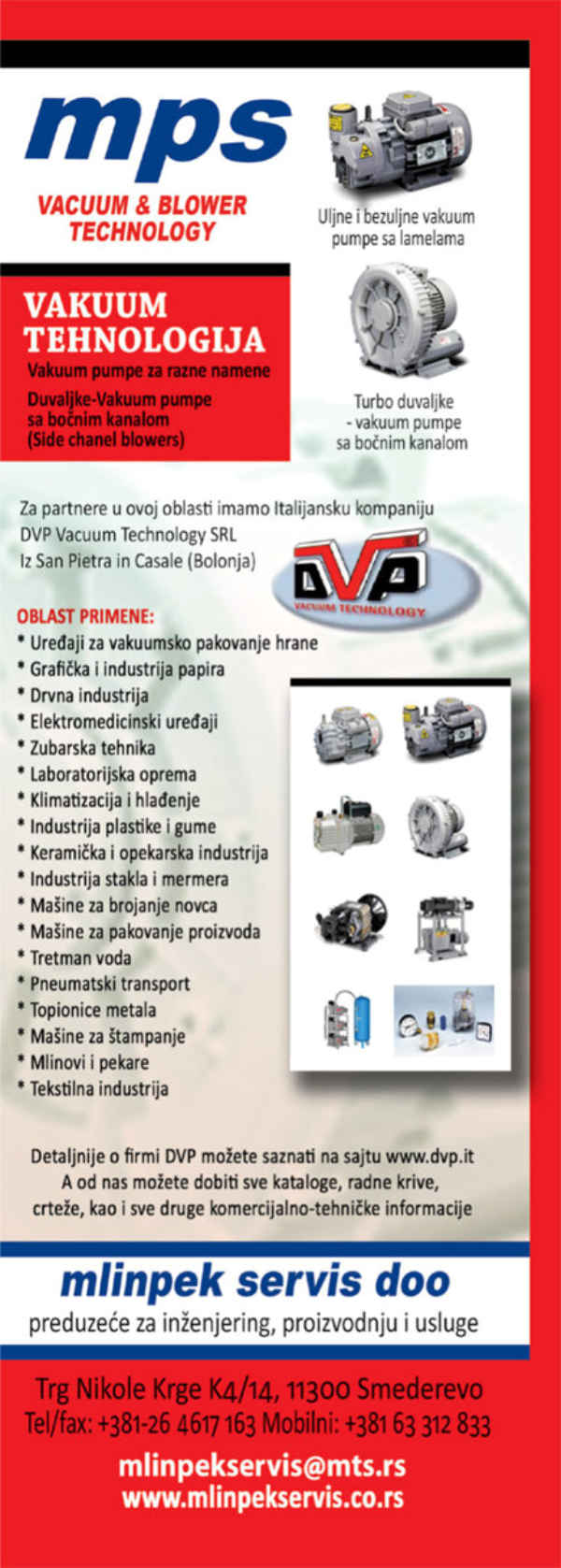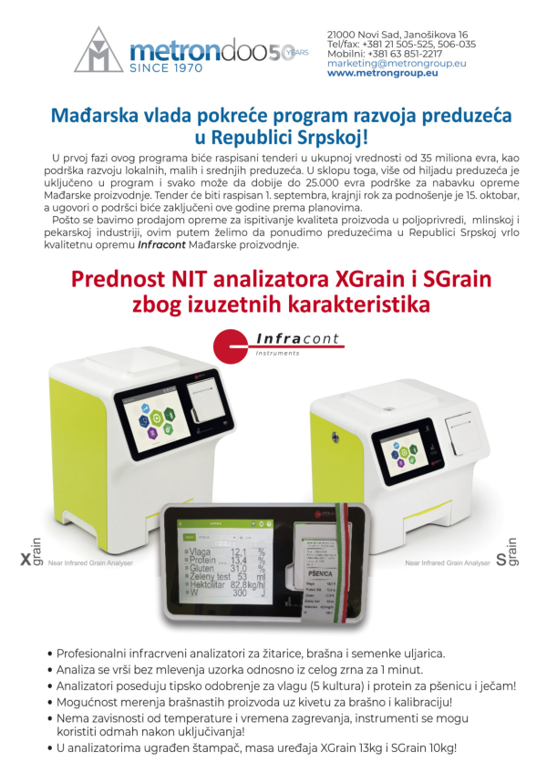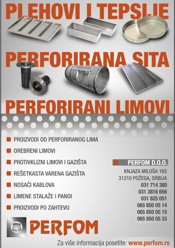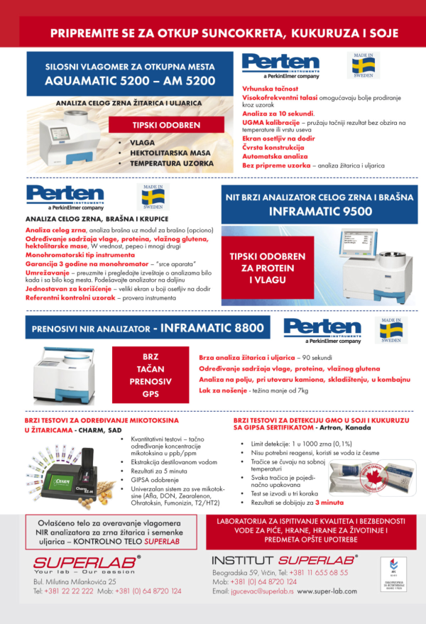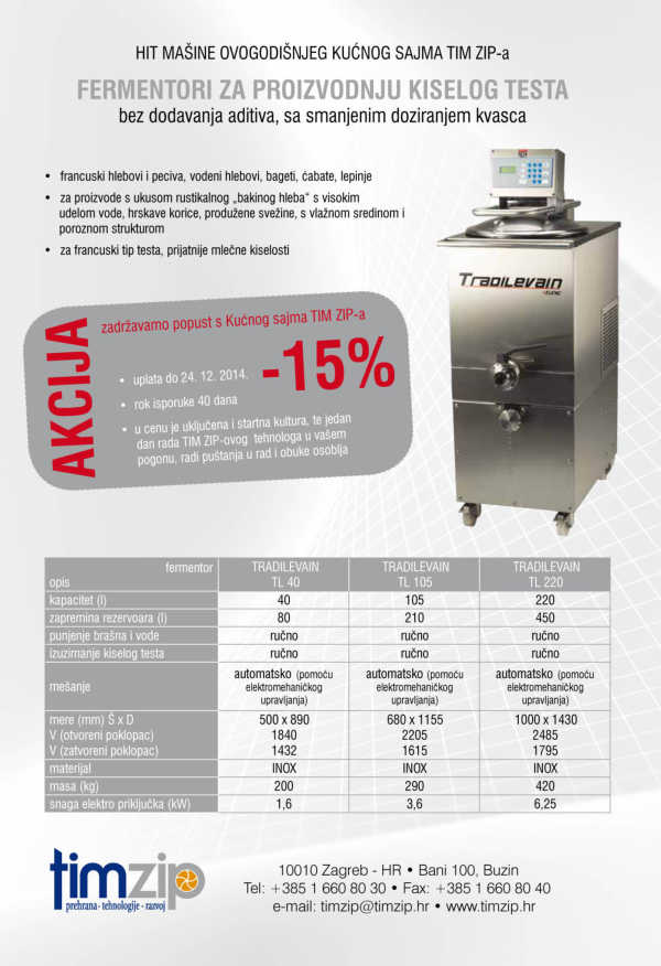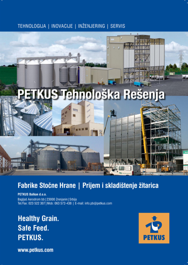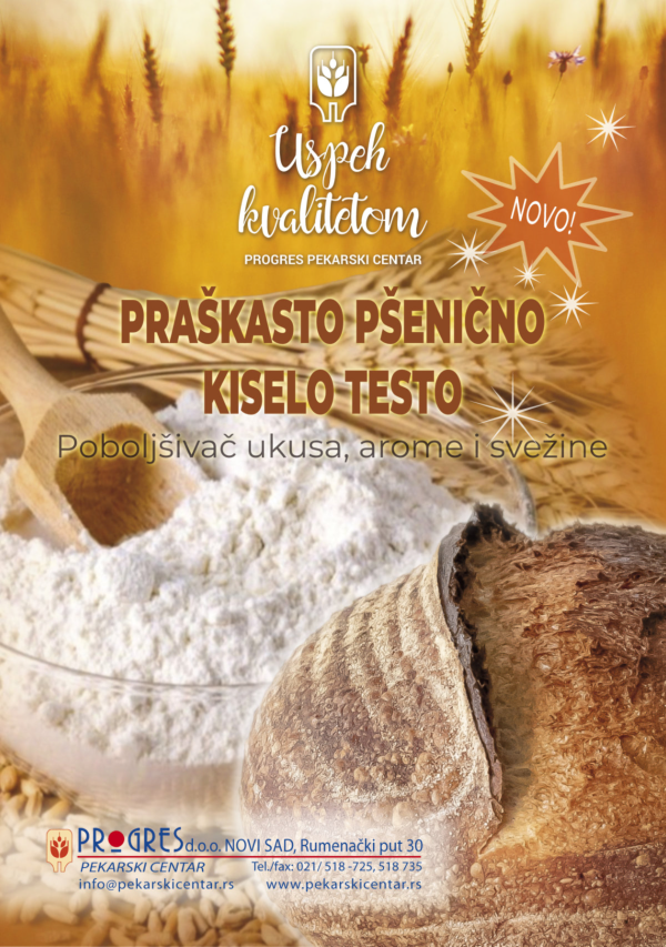 Na prodaju ispravna automatska linija za kilsko pakovanje brašna Fawema sa zbirnim pakovanjem, automatskom kon- trolnom vagom i termo tunelom. Dimen- zije kesice 115 x 65 x 330 mm. Kapacitet 17 t / 8 h. Godište 1993/2002. Može se videti u radu u JUB Šimanovci. Tehn. dir. Zagorka Mikić 063 107 27 27 Prodajem Aquatron nemačke proizvodnje (2.500 €) i aplikator za markice (3.500 €), moguć dogovor. Tel.: 062/212-638 Prodajem kompletnu Bühler-ovu silosnu opremu za brašno kapaciteta 950 tona (vibro­izu­zimači, razdelnici, transporteri, sterilizatori, duvaljke, obične i kompon- entne vage, šaržna mešalica, magnetni odvajači, sita, ustave, ventilatori, motori i cevi). Kontakt osoba: Slobodan, zvati od 10-20h, 063/212-839 Prodajem 6 valjnih stolica (Rosi Romeo), 2 šestodelna planska sita, pneumatika kom- plet (sa 12 i 10 ustava), 4 valjne stolice (Partisani), 1 valj­na stolica (Bühler), 2 osmodelna plan­ska si­ta, metalni aspirater (Zmaj), 2 trijera,1 dupla metalna ribalica (Zmaj) i praonicu. Kontakt: Miloš 064/44-26-405, 022-441-082 Prodaje se mlinska oprema: Vaga Vollenda VWE-9000 (Vollenda-WERK), 2 Mlinska aspira­tera mo­del SMA 10 M 6 t/h (Schmidt- Seeger), NP Ventilator za aspir- aciju aspiratera (VEM motors GmbH), 2 Ventilatora u sistemu pneumatskog trans- porta GBJ G09040 E4 RD i LG (Ocrim), Rezervni trupci za valjne stolice. Kontakt osoba: Zoltan 063/409-205 Na prodaju dupla ventil pakerica za brašno (25-50 kg) marke Paglierani. Kontakt: 063 80 46 650. Prodajem novu poluautomatsku ventil pu­ni­­licu za brašno od 5 kg. Kontakt: Milorad Batalo 063/521-577 Na prodaju valjna stolica SANGATTI 600×220, dva kvadratna planska sita čet- vorodelna DOMŽALE, dva drvena planska sita četvorodelna SANGATTI, dve mešalice za brašno dužine 3 metara, tri vrgača POBEDA, pužni transporteri fi150-200, kofičasti elevatori kapaciteta 10-15t/h, mlinski trijer ZMAJ, pneumatski ventilator kapaciteta 100t/24h. U ponudi takođe i aspiracione cevi i lukovi raznih prečnika i dužina i dva elektro ormara za mlin sa pratećom opremom. 062 84 06 124 Petar Na prodaju mlinska oprema: 5 valjnih stol- ica 800 MIAG kapaciteta 35 t/24h, sito osmodelno ZMAJ, ventilator pneumatski Bühler sa motorom 30kW, 2 silosa 5m prečnika i 13,5m visine, 4 silosa 3m prečnika i 13,5m visine. Mašine su u radu, sve ispravno. Imamo i majstora za montažu. Brana 063/276-098, Saša 063/214-920 Prodajemo četke za planska sita Itali- janskog proizvođača SIAT. Dimenzije 120x105 cm i 135x 105 cm. Povoljno – dok zalihe traju. 011 39 45 244 Prodaje se kompletan mlin za pšenicu, kapa­citeta 33 t / 24 h. Cena 110.000 eura. Mlin Telečka, Sombor. Za sve dodatne informacije pozovite +381-63/474-817